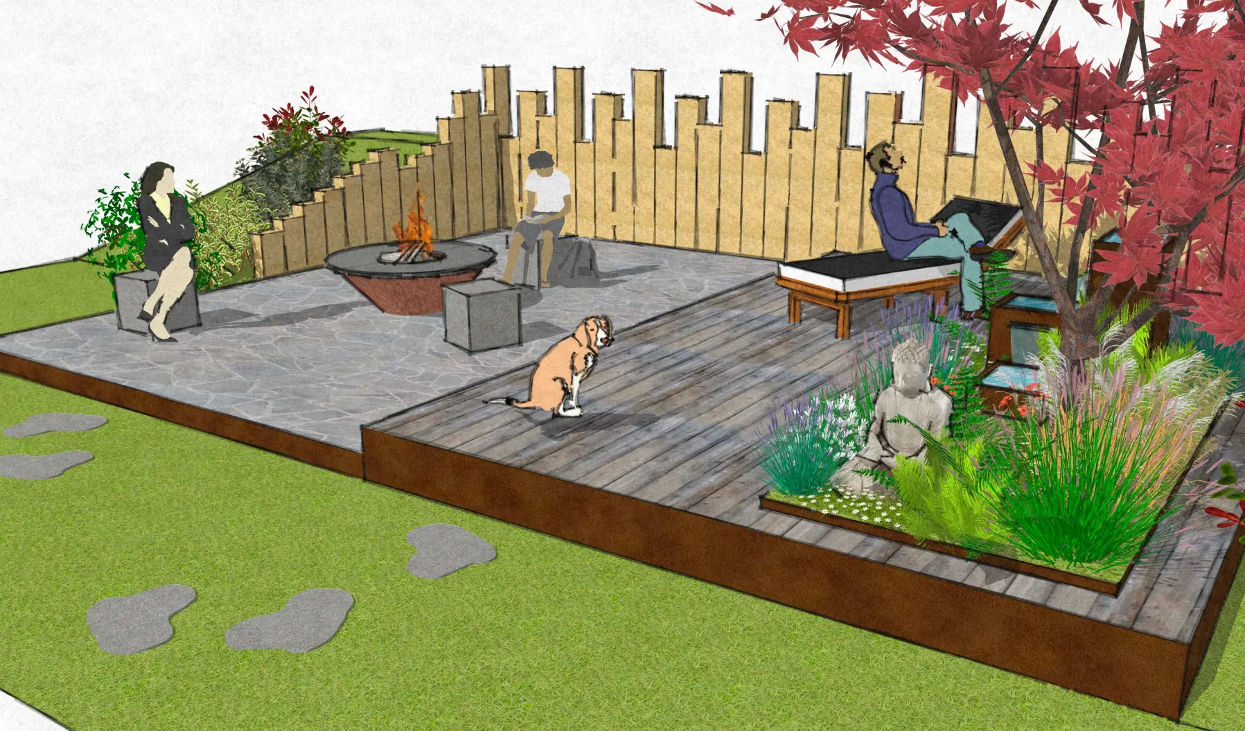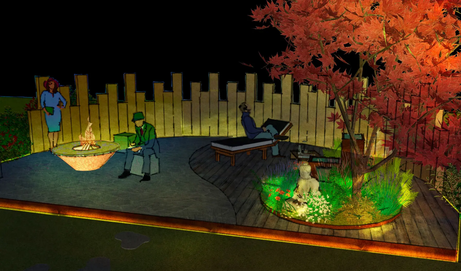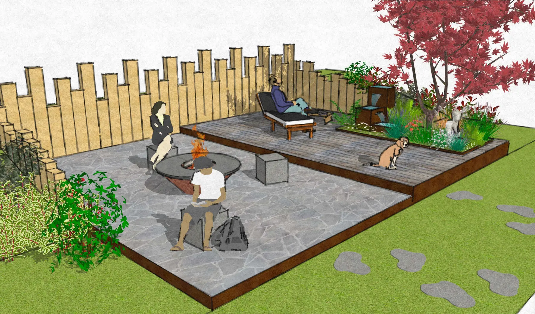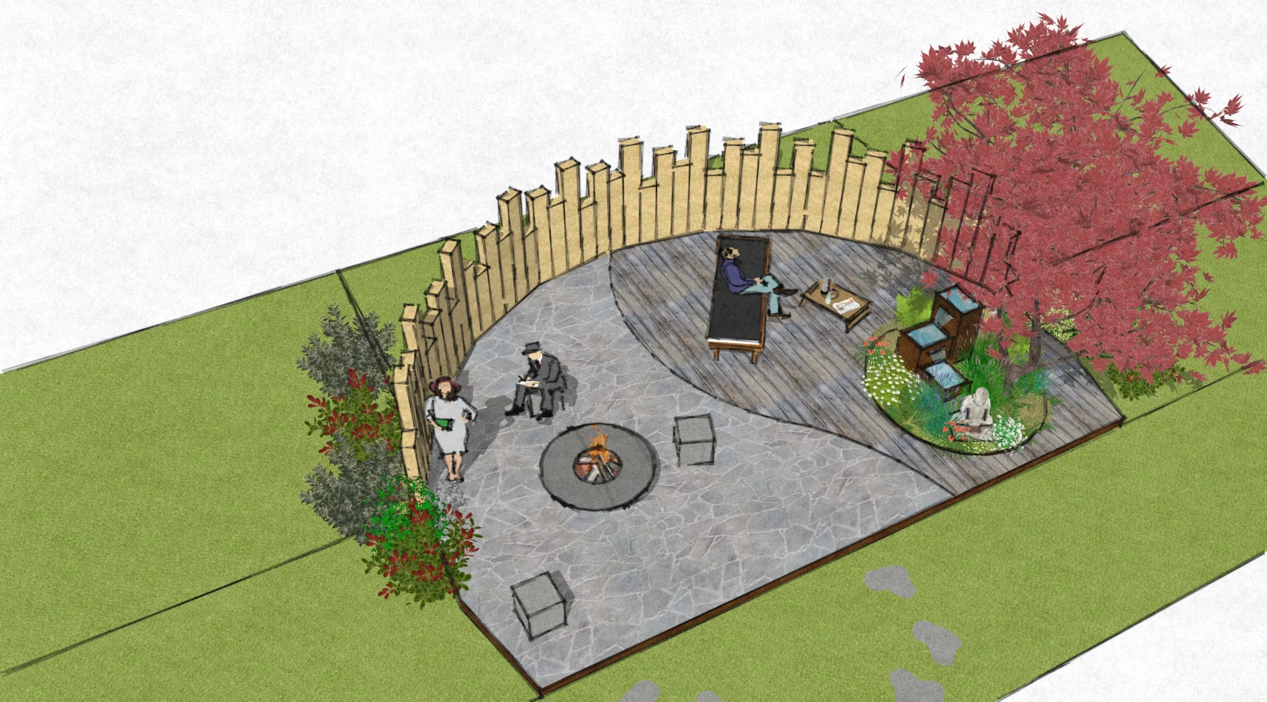 Définition d’un programme de terrasses extérieures sur les thématiques de l’eau et du feu; développement et présentation de deux variantes de projet.